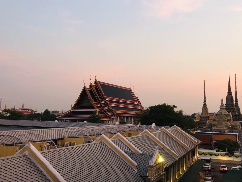 통창에서 보여지는 노을진 왓포 사원뷰ㅠ