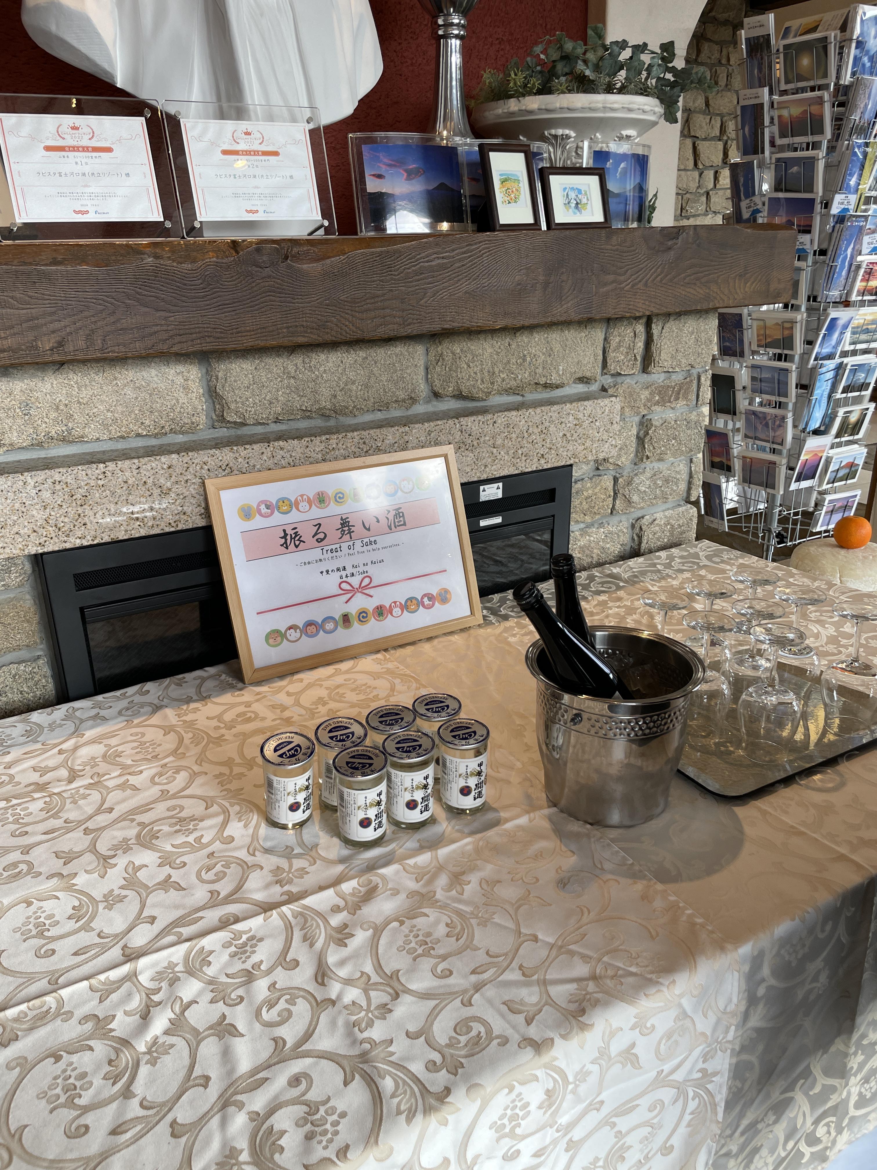 라 비스타 호텔에 로비에 사케가 무료로 제공되고 있어요.