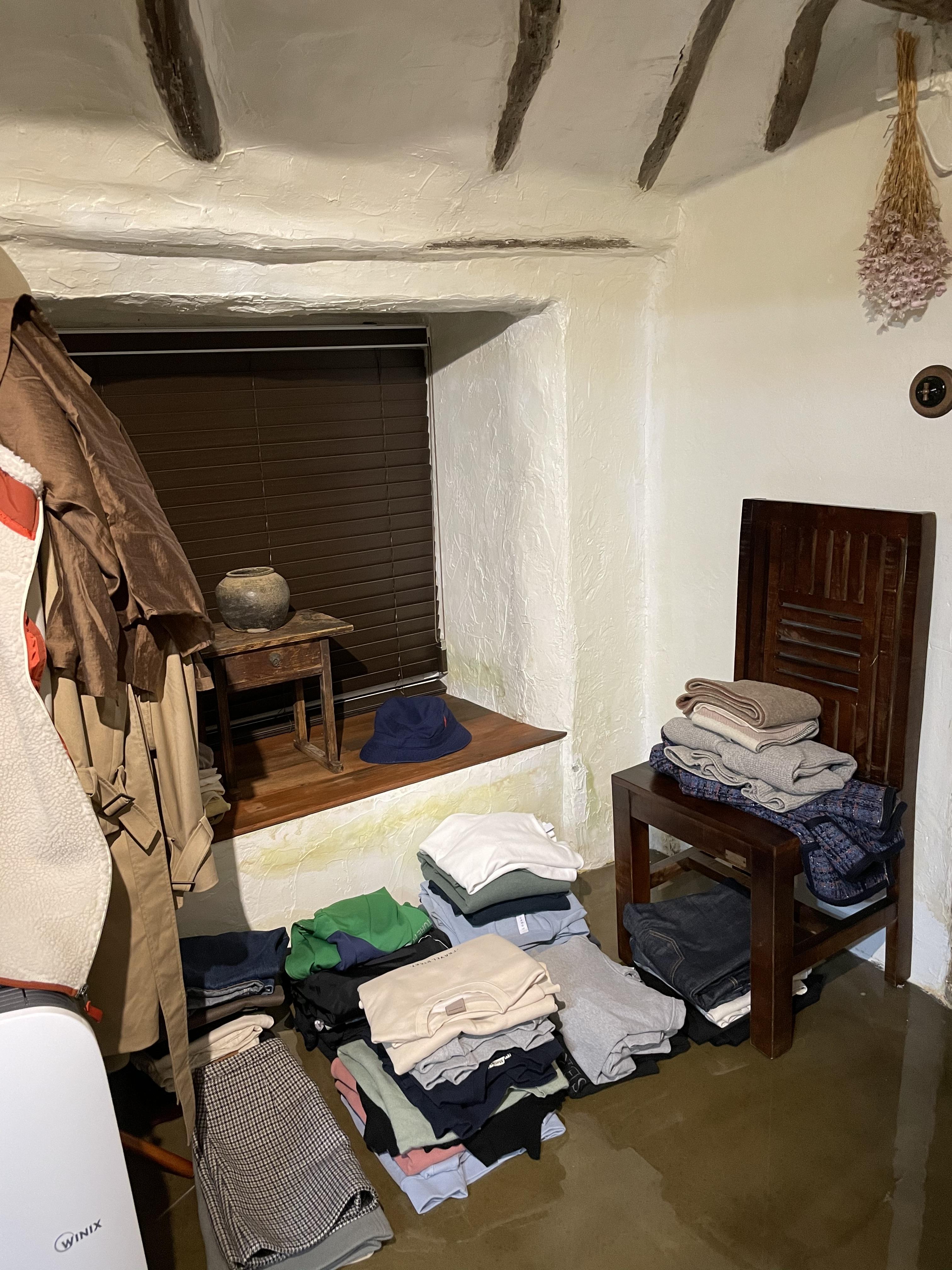 2주살이를 했던 저희는 바닥에 옷을 둘 수 밖에 없었어요.